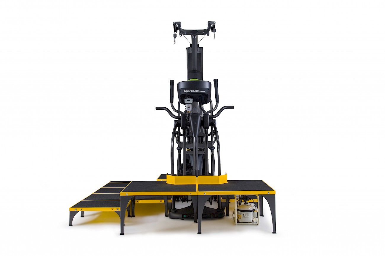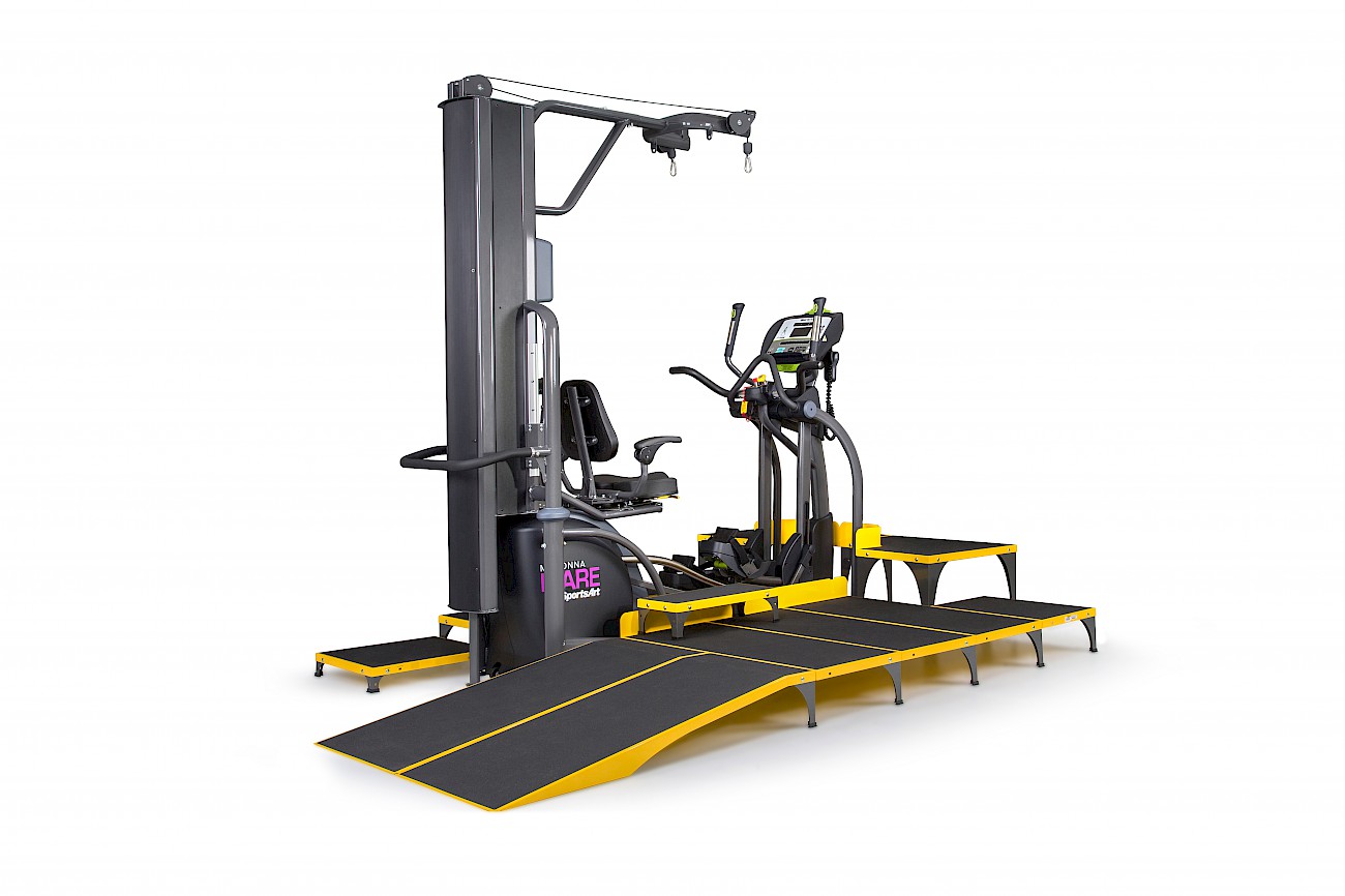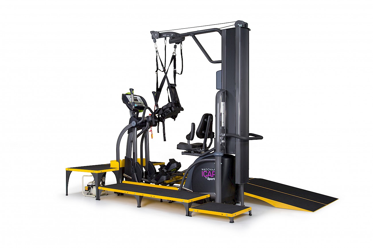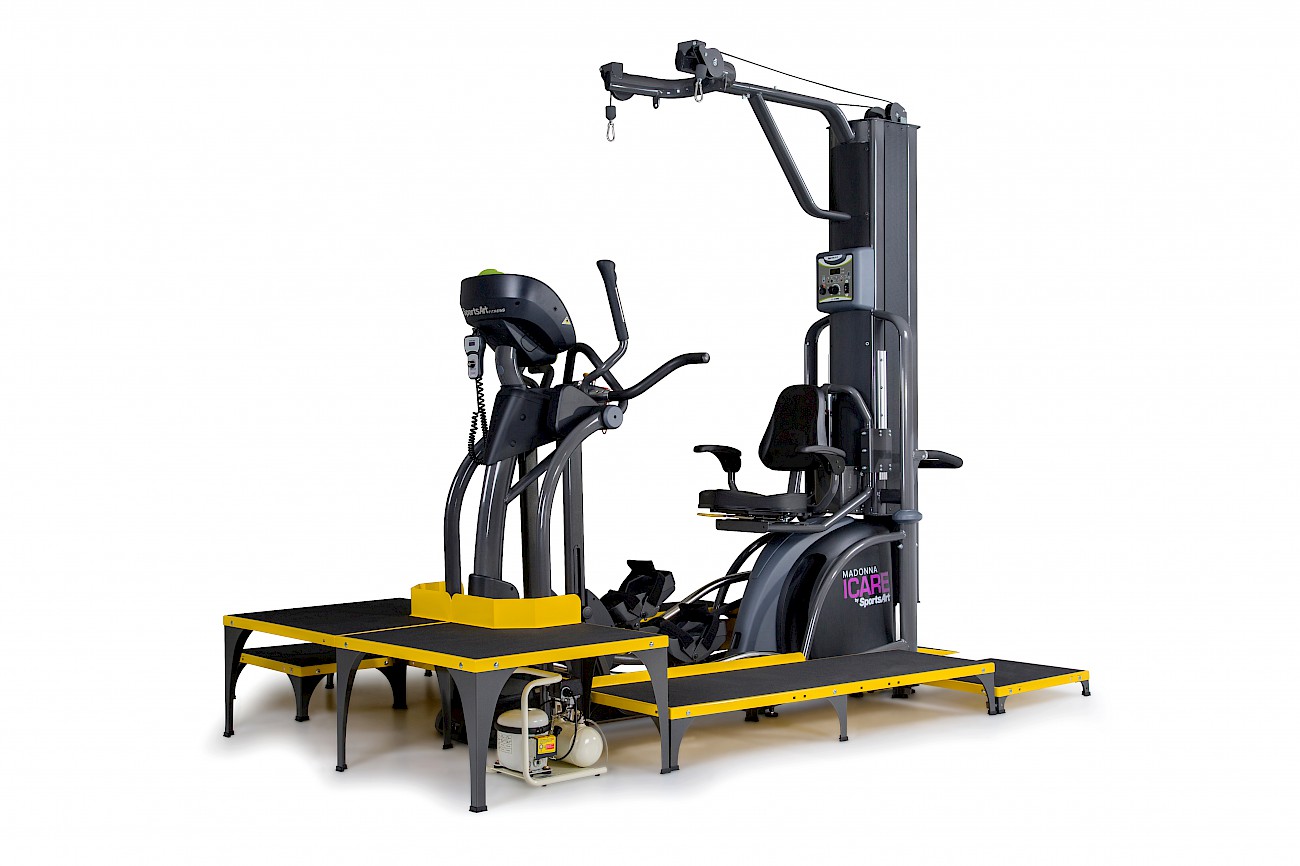 ICare składa się z trzech podzespołów: eliptyki E875MA, Systemu odciążeniowego E875MU oraz rampy dla wózków inwalidzkich wraz ze schodkami i platformą E875MP.