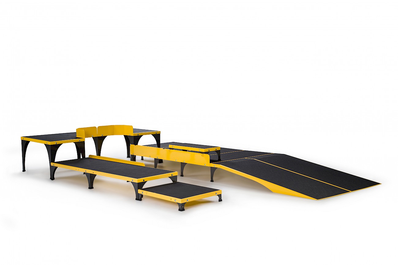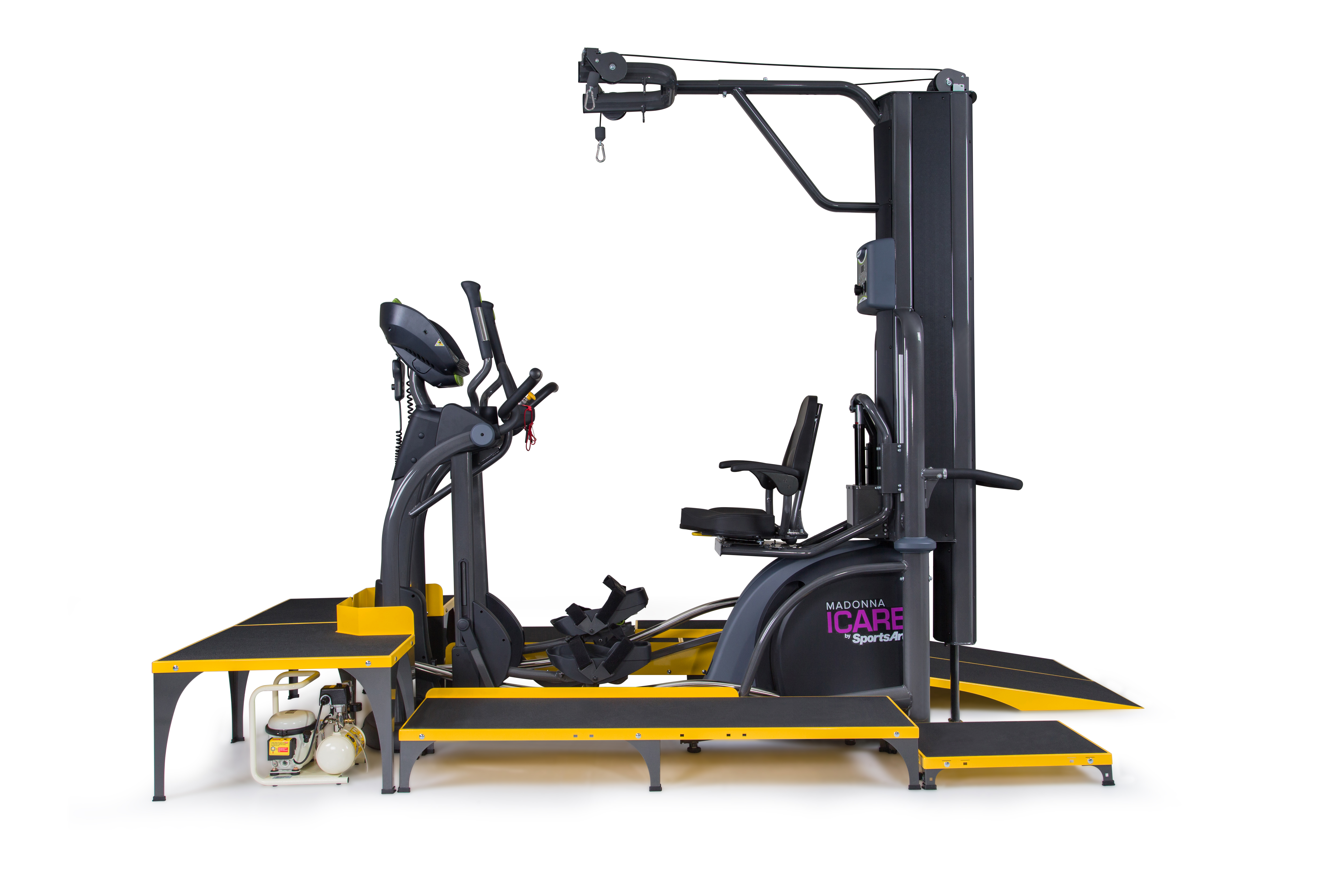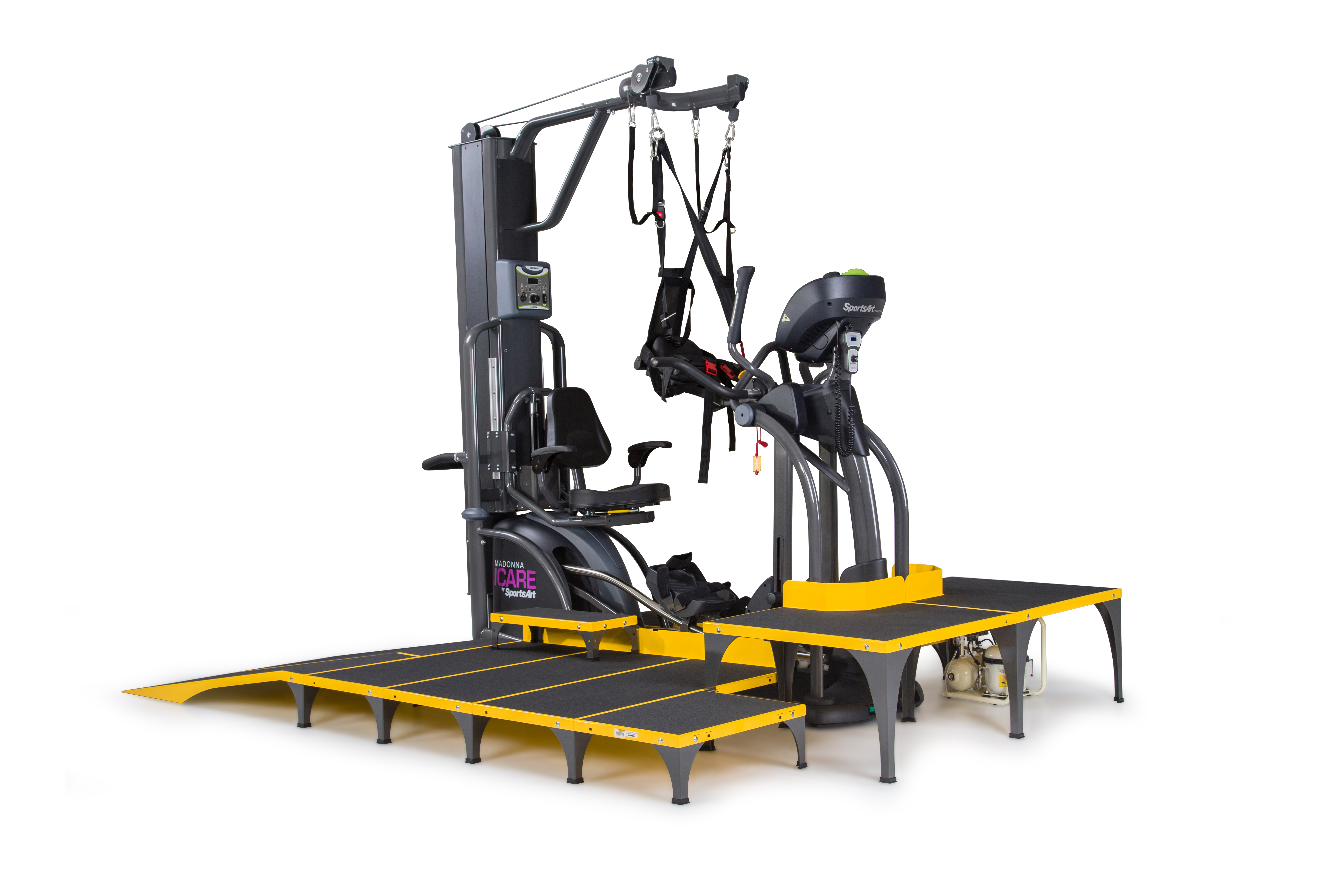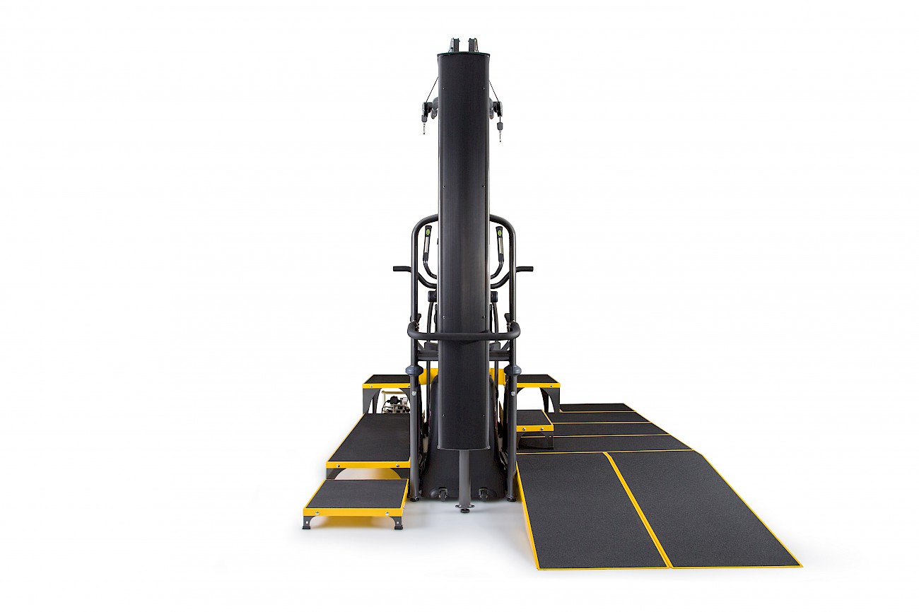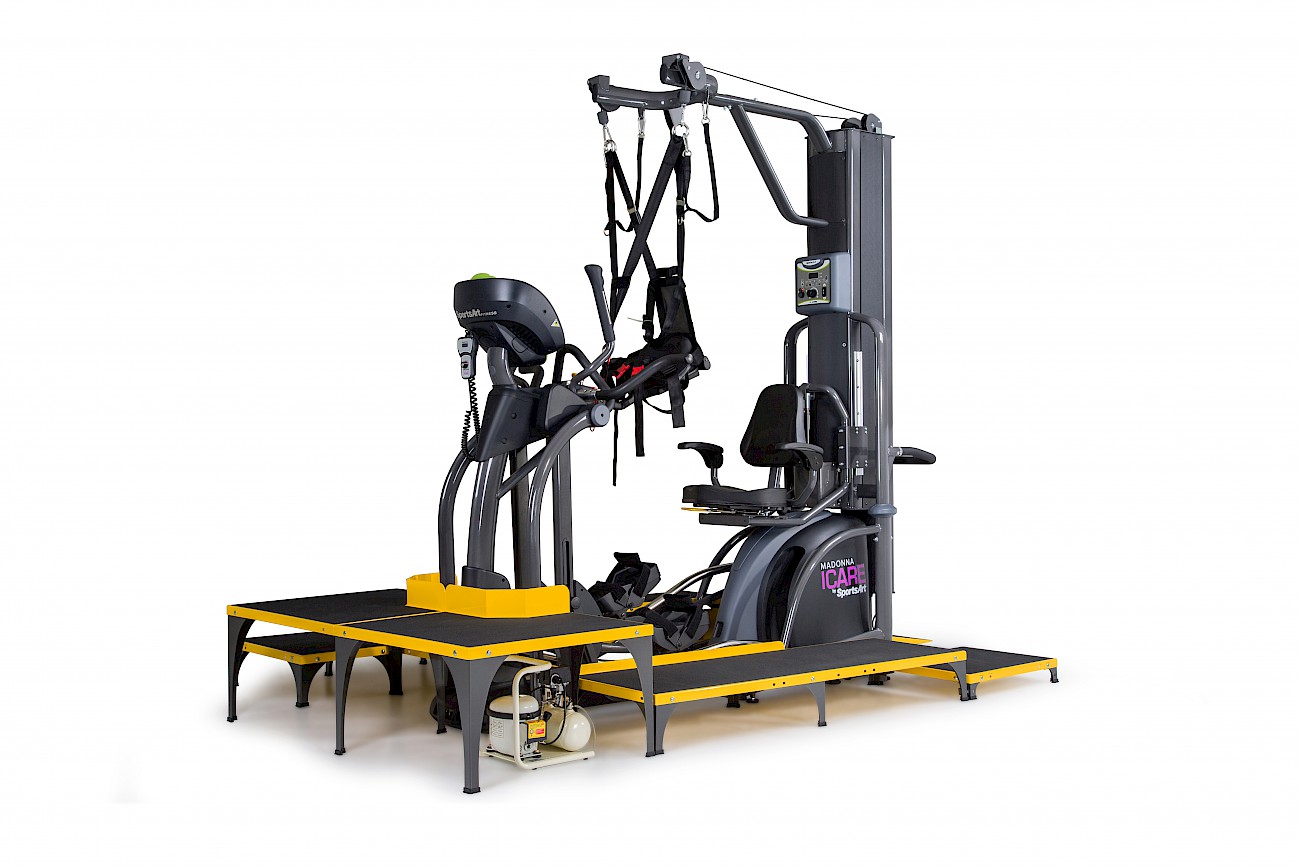 ICare składa się z trzech podzespołów: eliptyki E875MA, Systemu odciążeniowego E875MU oraz rampy dla wózków inwalidzkich wraz ze schodkami i platformą E875MP.